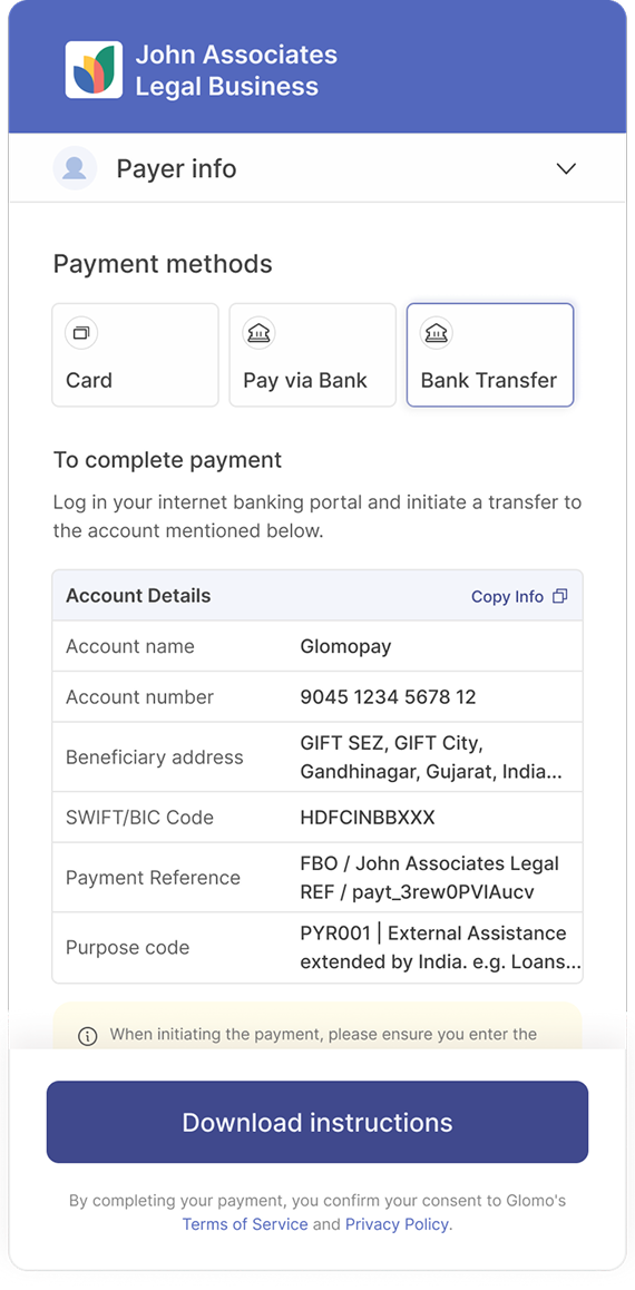 Glomo supports Bank Transfers as a payment method for businesses to collect funds directly from customers via domestic bank rails. Glomo issues a unique virtual bank account number to facilitate payment collection via bank transfer. Customers can initiate transfers from their own banking app or at their bank branch, sending funds directly into this virtual account.