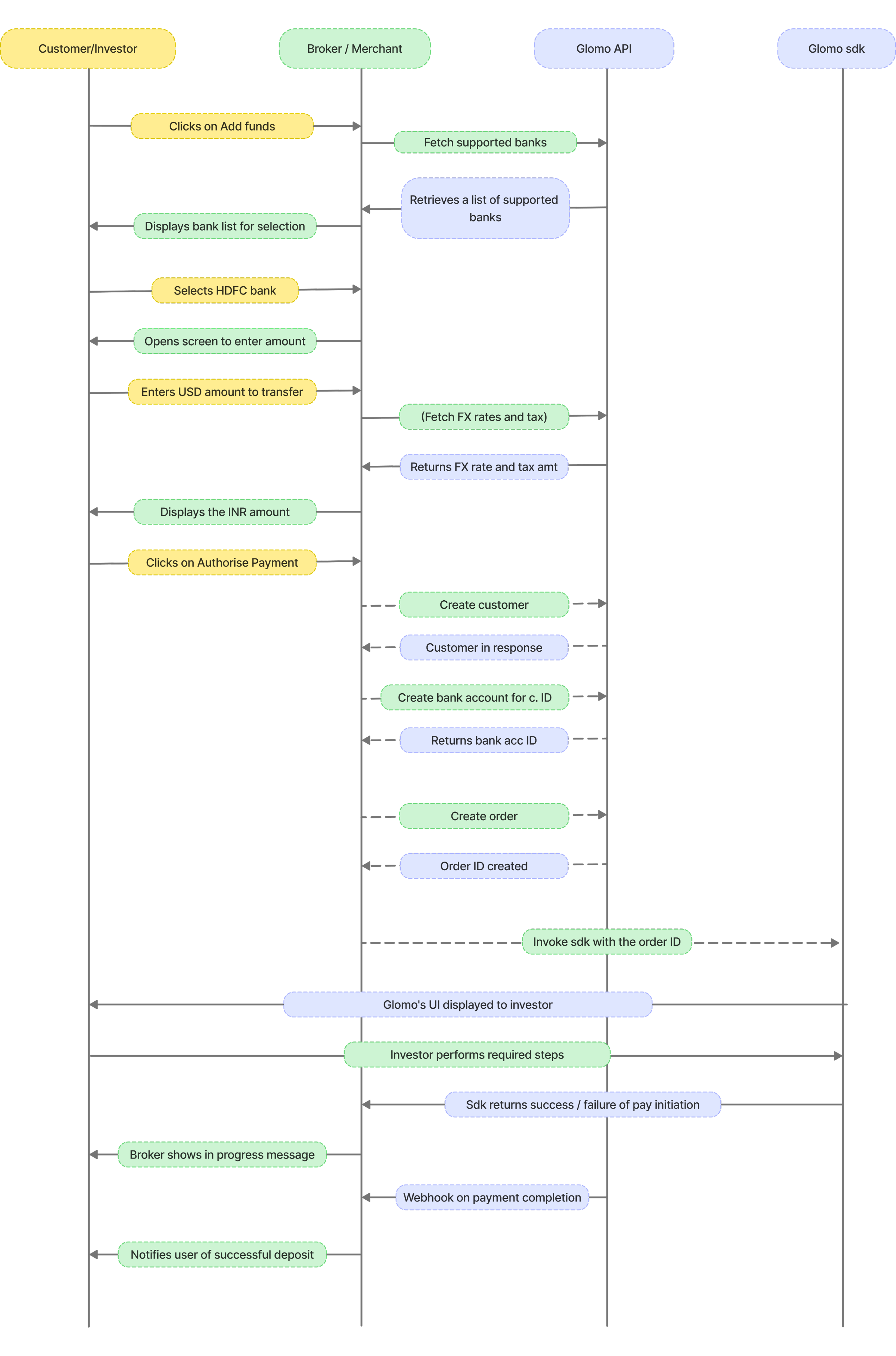 The sequence diagram below represents the interactions between the investor, broker, Glomo Web SDK, and Glomo API.